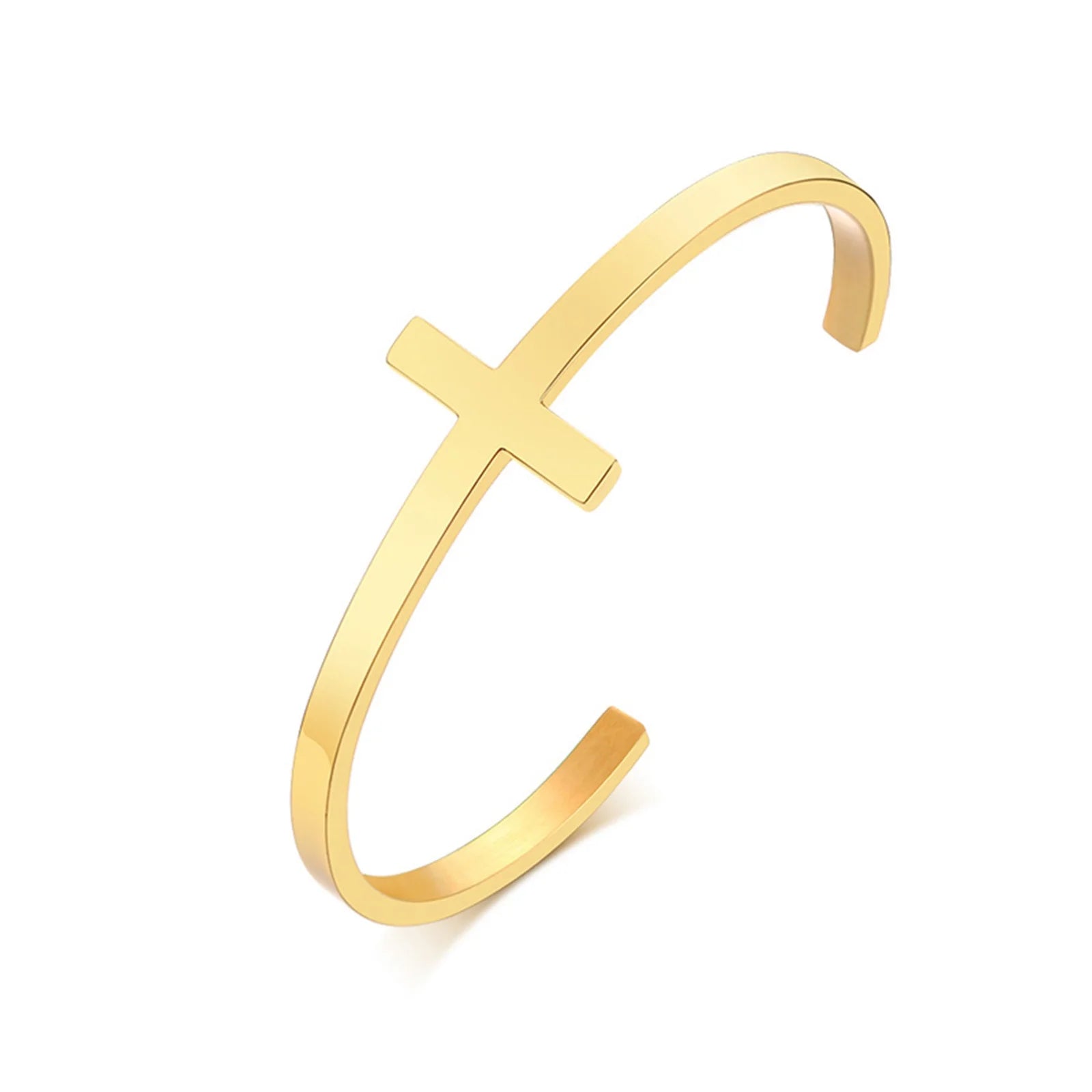 Its open design allows for an easy, comfortable fit while maintaining a modern, polished look. Perfect worn alone or stacked with other bracelets, this cuff is a subtle yet meaningful reminder of faith that moves with you throughout the day.