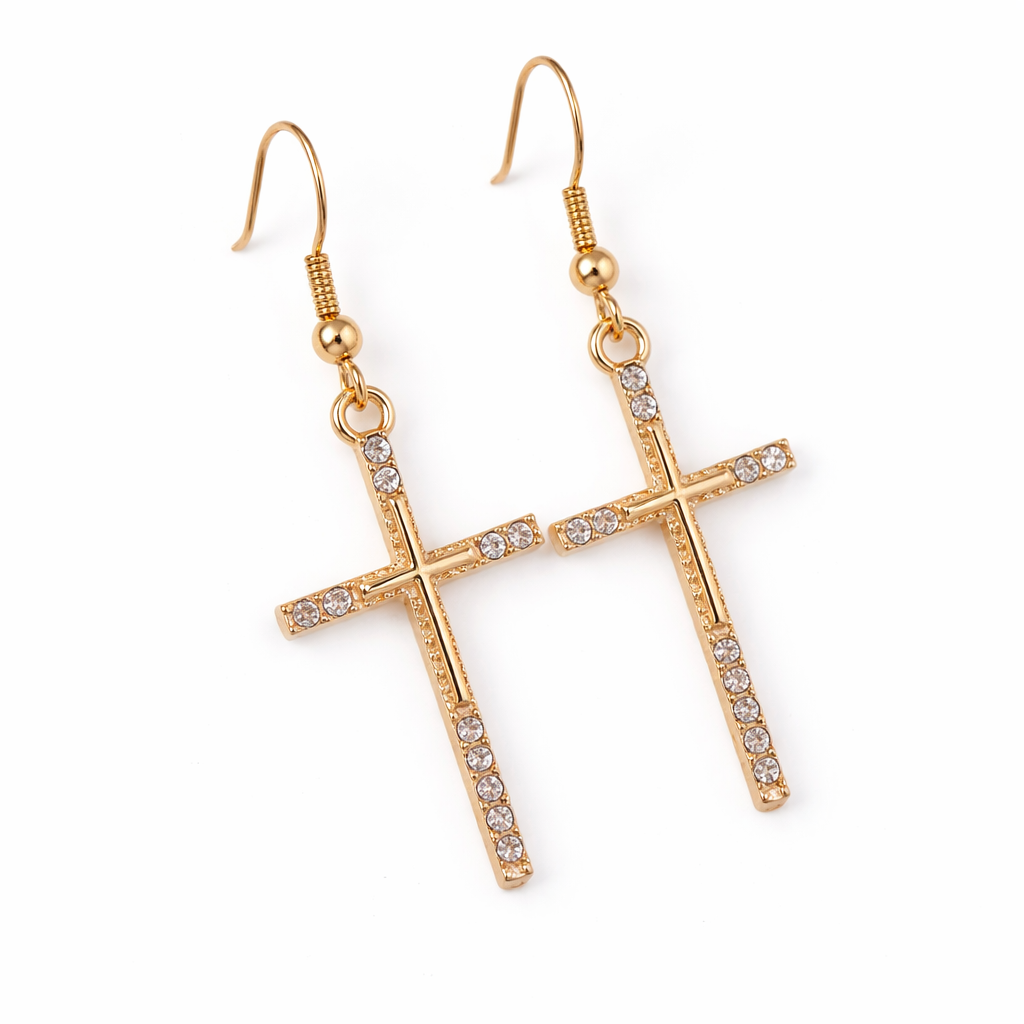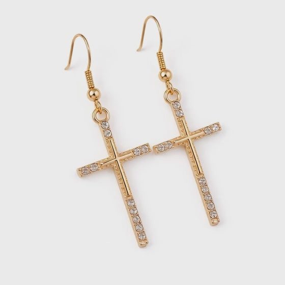 Our Radiant Cross Dangle Earrings feature sleek gold-tone crosses accented with delicate crystal detailing that catches the light with every movement.